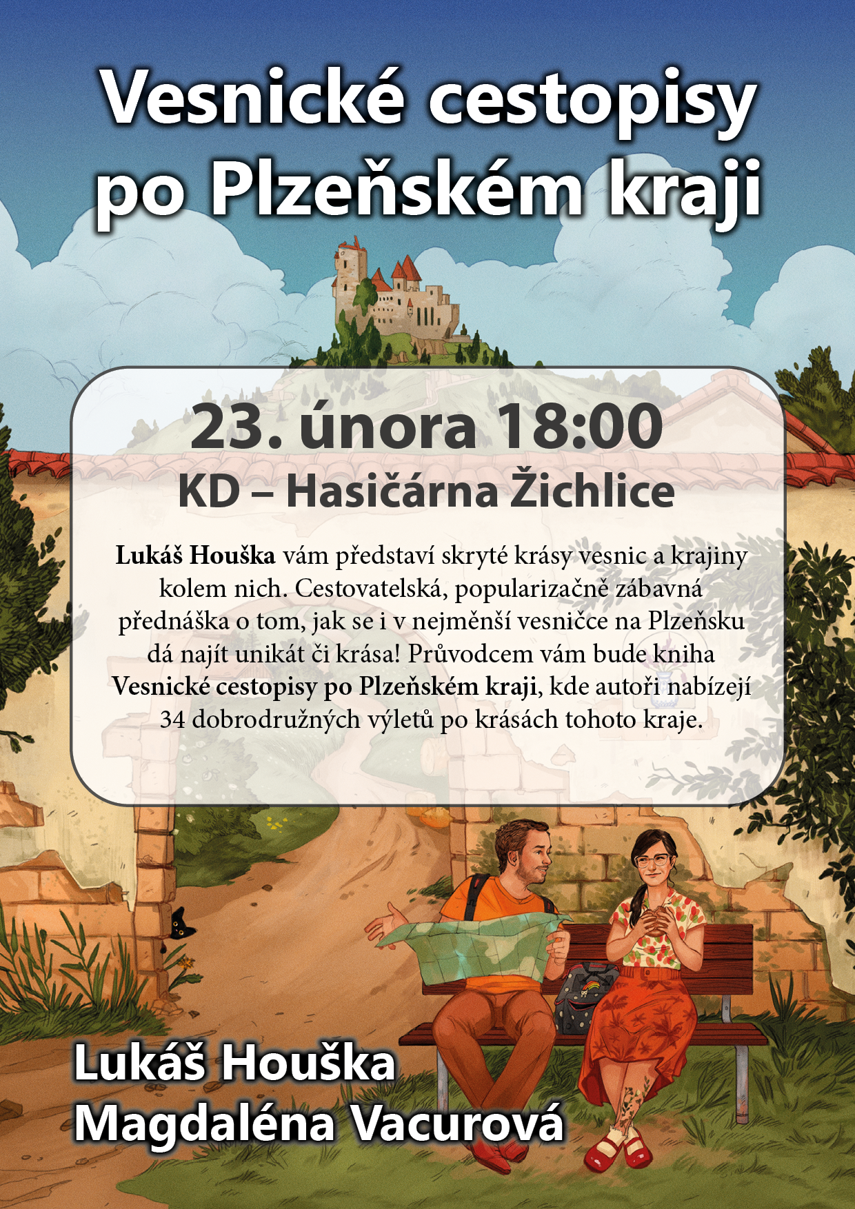 Zveme vás na besedu s Lukášem Houškou, která se uskuteční 23. února 2026 od 18 hodin v hasičárně v Žichlicích, čp. 3. Přednáška bude zaměřena na knihu Vesnické cestopisy po Plzeňském kraji, kde se dozvíte zajímavosti o různých místech a tradicích.